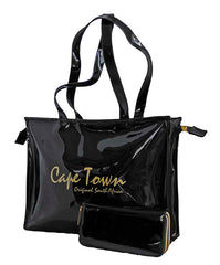Fino DT5+8146-798 Faux Patent Leather Cape Town Souvenir Tote Handbag & Purse Set - Black